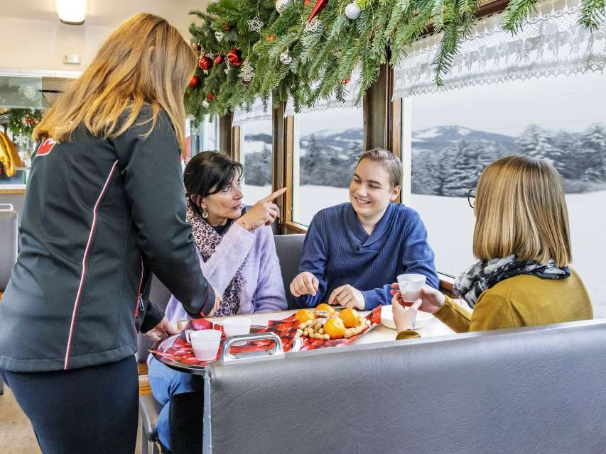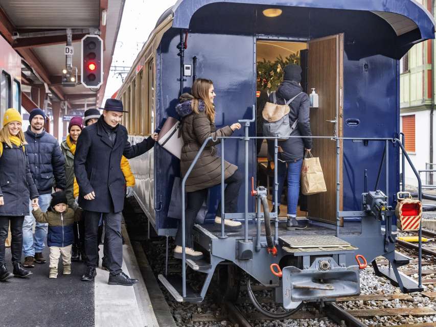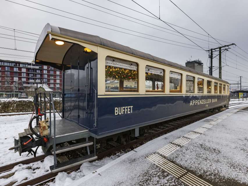 Wir bieten Ihnen ein spezielles Erlebnis zum Sonntagsverkauf in Appenzell oder verwöhnen Sie gerne nach einem Tag voller Eindrücke im Weihnachtswagen. Steigen Sie auf der Linie Gossau bis Appenzell oder in umgekehrter Richtung in den Buffetwagen ein und geniessen Sie feine Biberli, Nüssli und Mandarinen sowie heissen Glühmost. Das aussergewöhnliche Ambiente in unserem nostalgischen Buffetwagen können Sie mit einem Ticket aus dem normalen Billettsortiment erleben.