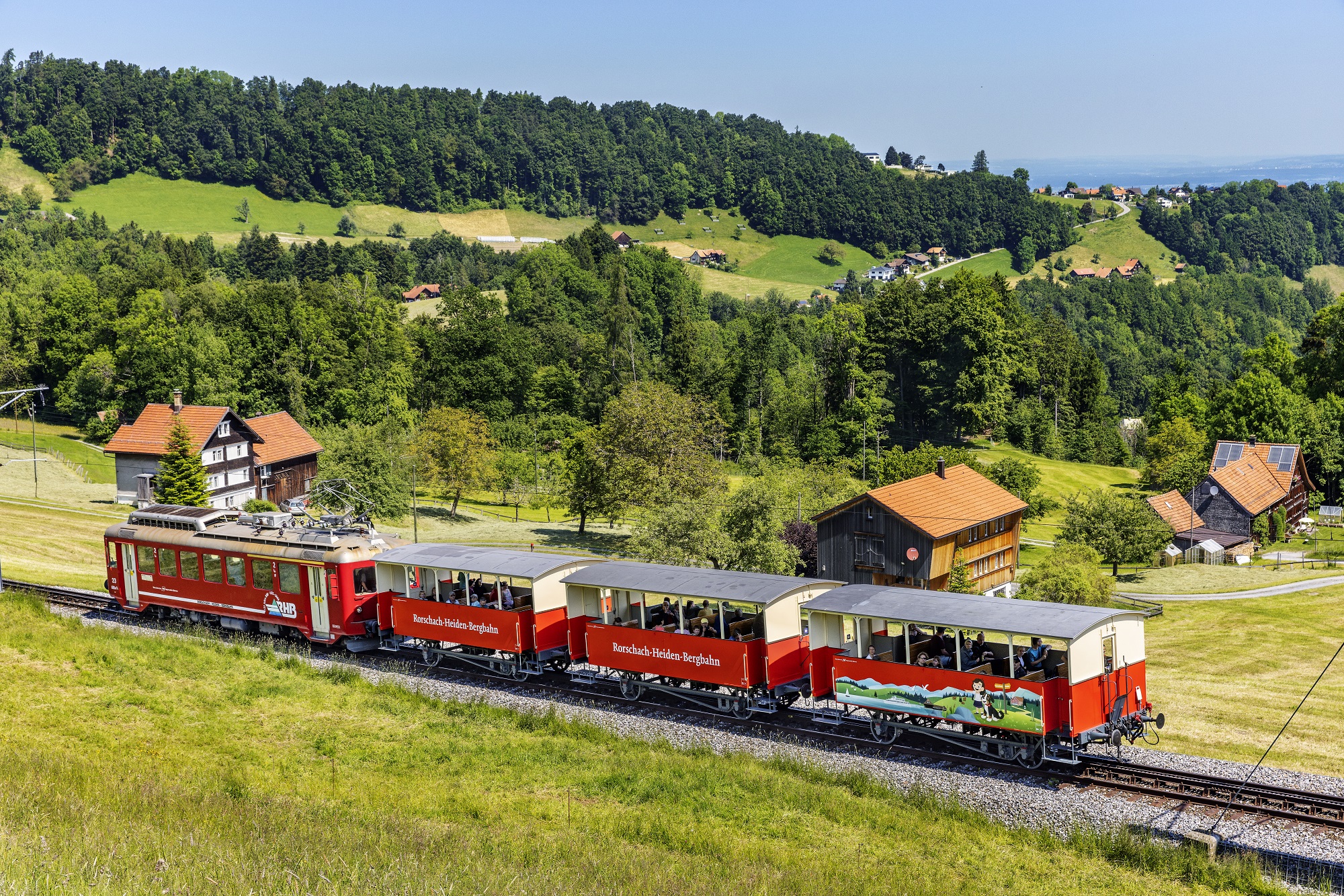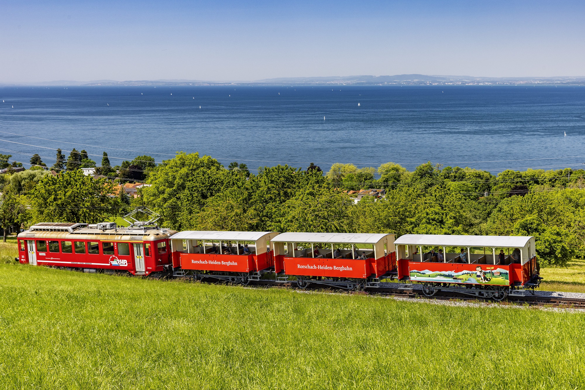 Die Sommerwagen der Zahnradbahn Rorschach-Heiden sind täglich bei schönem Wetter im Einsatz. Die offenen Aussichtswagen erscheinen ab diesem Sommer in einem neuen Design. Die Zahnradbahn Rorschach-Heiden ist Teil der Erlebnisrundfahrt, die den Witzweg, die Zahnradbahn Rheineck-Walzenhausen sowie die Schifffahrt von Rheineck nach Rorschach beinhaltet. Der aktuelle Wasserstand macht die Schifffahrt auf dem Alten Rhein möglich.