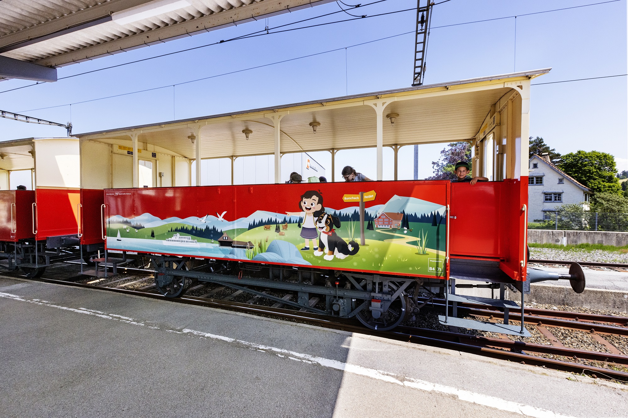 Die offenen Aussichtswagen der Zahnradbahn Rorschach-Heiden stammen aus dem Jahr 1875. Auf diesen Sommer 2023 haben die Appenzeller Bahnen (AB) die Aussichtswagen renoviert und einem neuen Design unterzogen. Die fröhliche Folierung bildet unter anderem die Hündin «Abelina» ab, die als Maskottchen für die AB dient. Die offenen Aussichtswagen der Linie Rorschach-Heiden verkehren während den Sommermonaten täglich bei schönem Wetter. Es gilt das normale Billettsortiment.
